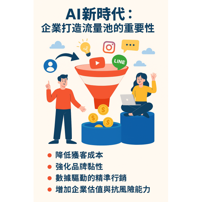 流量池,即企業自己累積和擁有的用戶資源(會員資料、粉絲社群、LINE官方帳號、APP用戶等),成為現代企業的核心資產。掌握流量池,等於掌握主動與用戶互動、推廣新產品、提高營收的主導權。